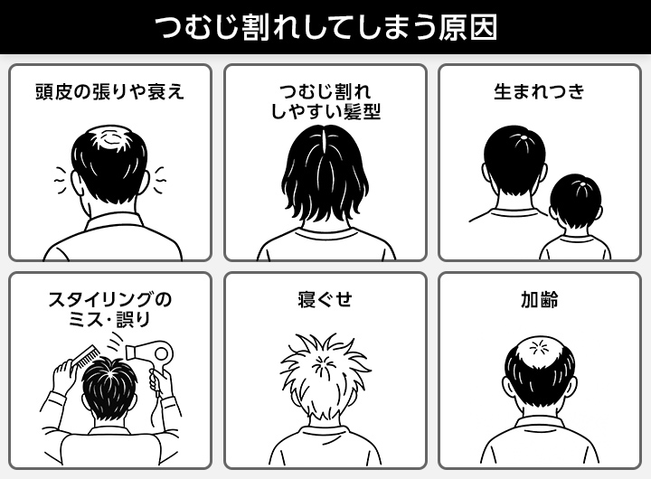 生まれつきの髪質やつむじの位置・量によって、つむじ割れが起きていることもあります。