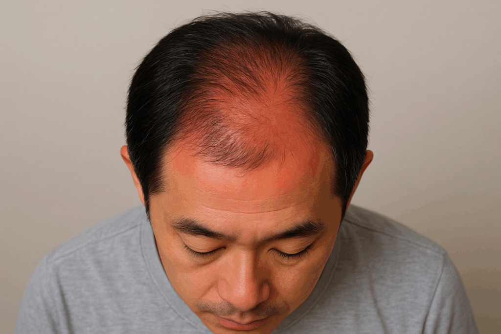 頭頂部の頭皮が赤くなっていたら、つむじはげを疑ってください。